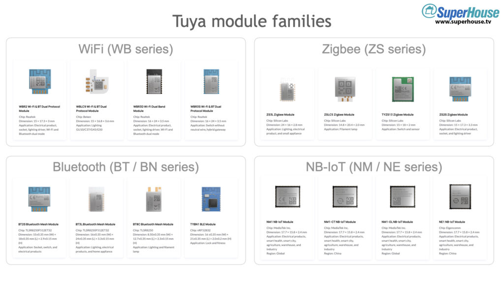 Tuya makes a range of modules to suit different purposes, grouped into families based on the radio type. They have families for: